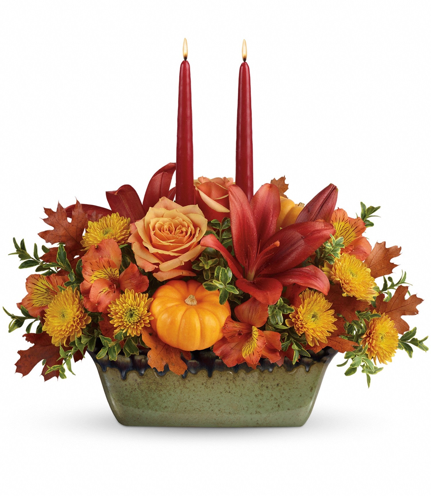 This fall favorite is two gifts in one, featuring a glorious autumnal bouquet hand-arranged in a gorgeous, hand-glazed stoneware serving dish.