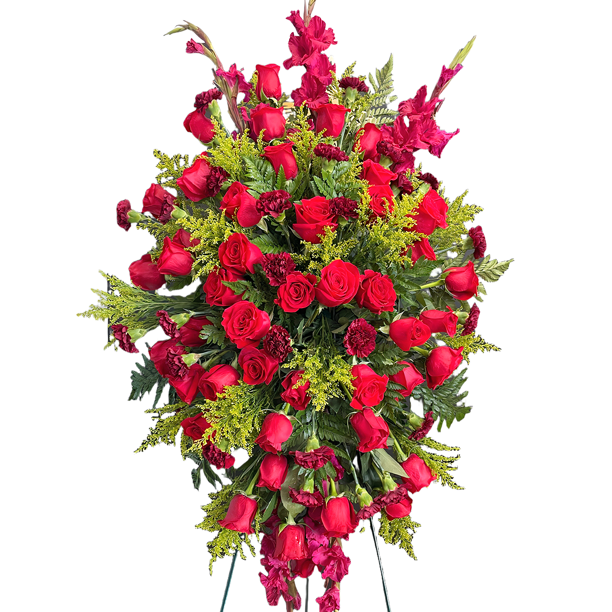 This rich, radiant spray of red roses, gladioli and other popular red flowers during a time of loss conveys a message of reassurance and hope in a difficult time.