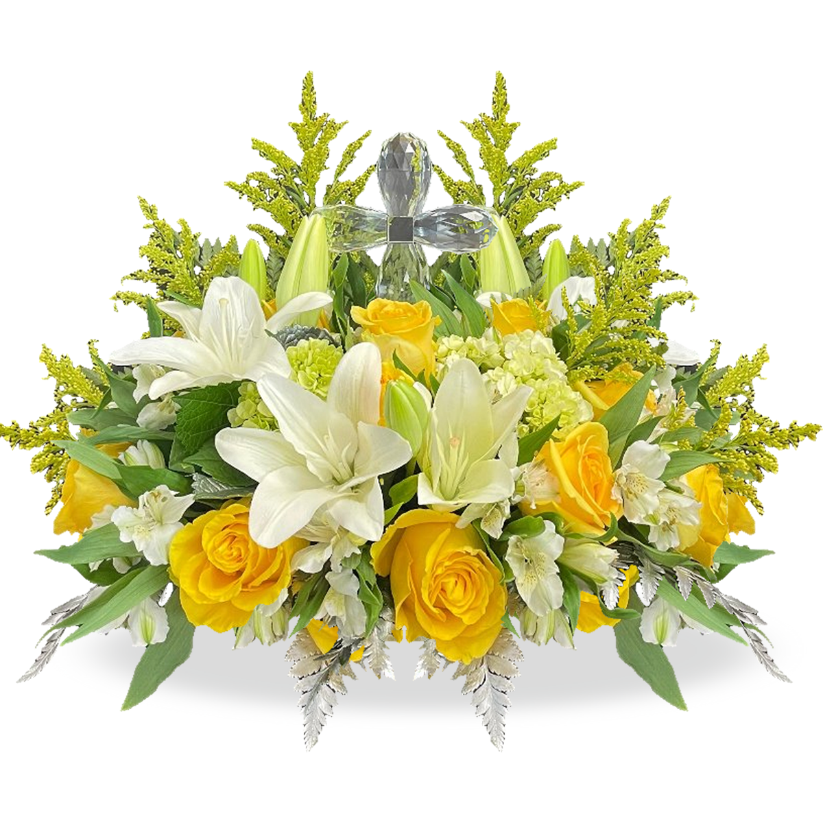Offer a serene and respectful tribute with the “Eternal Serenity Sympathy Arrangement” from Days Flowers Florida. This beautiful arrangement features a delicate blend of pure white lilies symbolizing peace and innocence, alongside soft yellow roses that convey friendship and warmth. Accents of vibrant green foliage add a touch of life and renewal, while the subtle presence of white chrysanthemums represents loyalty and devoted love. Each bloom is meticulously arranged to create a harmonious display that expresses heartfelt condolences. This arrangement is not only an embodiment of beauty but also carries deep symbolic meanings, making it an ideal choice for expressing sympathy with grace and dignity.