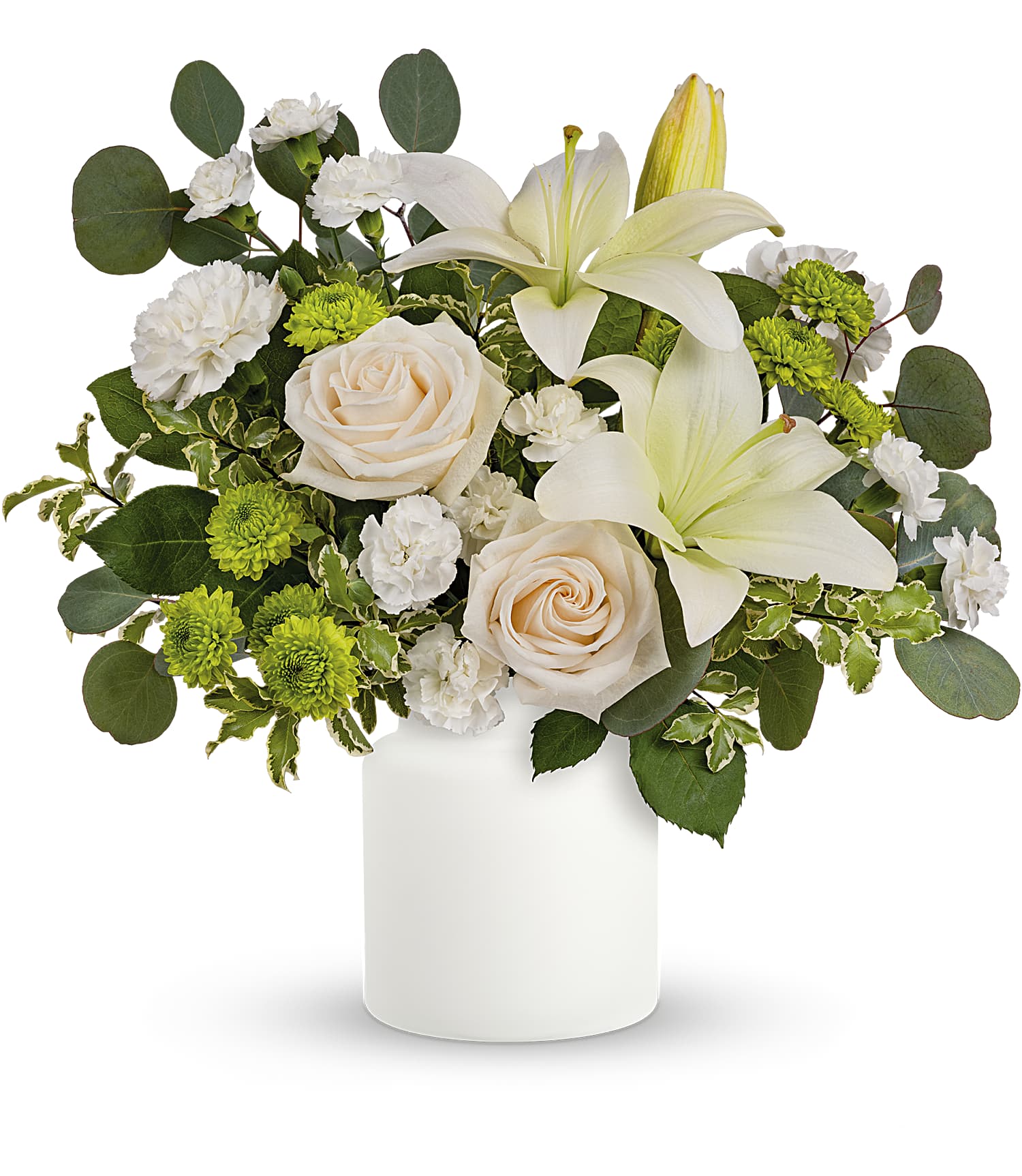 This ethereal arrangement is a calming, peaceful gesture that shows them you care. Elegant white blooms accompany a timeless matte white vase.