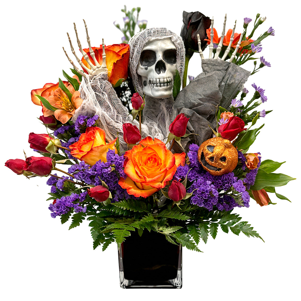 A mysterious, hooded skeleton emerges majestically, flanked by its bony hands, creating an unforgettable atmosphere. Around our guardian, vibrant roses in intense orange and fiery red burst forth, contrasting with the depth of dark roses and the mystery of purple limonium that simulates an enchanted mist. A small, sparkling Halloween pumpkin smiles amidst the profusion of flowers, adding a playful touch. Dark green fern foliage creates an earthy, gothic base for this ghostly scene.