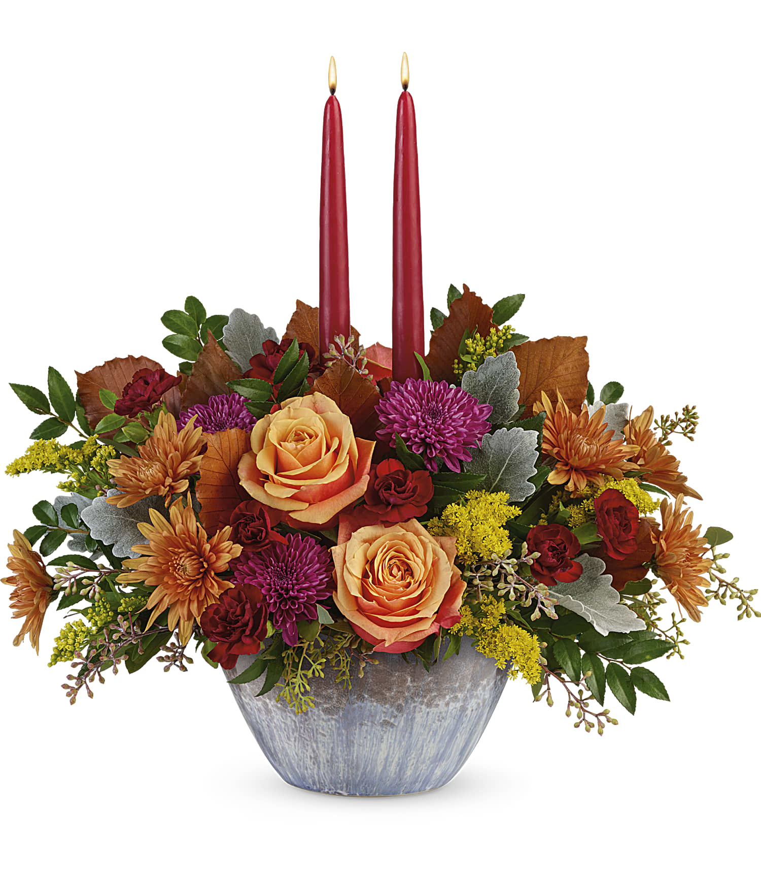 A bounty of warm wishes for a happy fall! This lush autumnal rose centerpiece is arranged in a stunning, oven-to-table ceramic serving bowl with gorgeous artisanal glaze in steel blue hues--a gift they'll enjoy for many years to come!