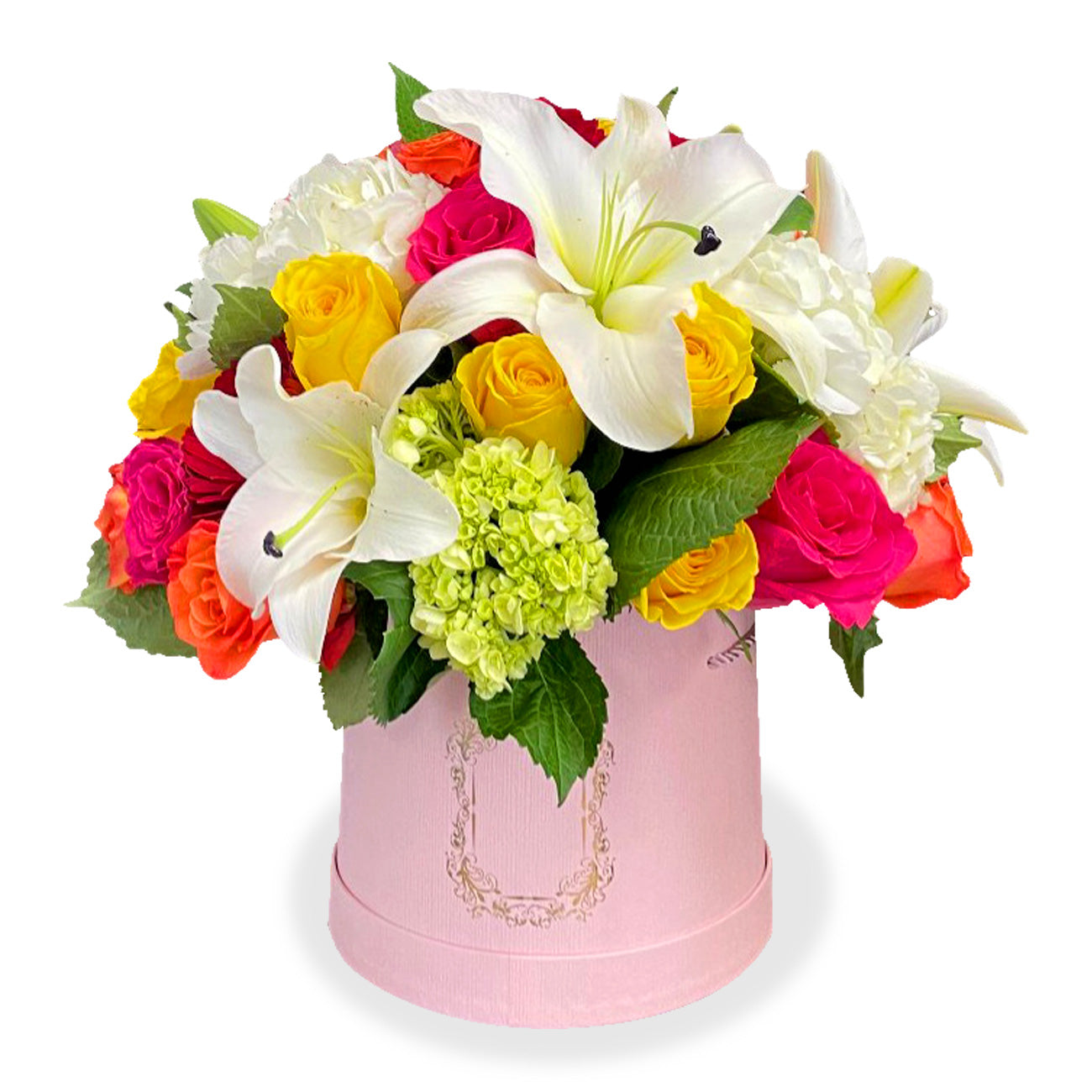 Step into a world of warmth and elegance with our “Sunshine Serenade” arrangement, a luxurious bouquet that captures the essence of Florida’s sunny charm. This stunning display is artfully arranged in a fashionable pink hatbox, creating a perfect harmony of color and fragrance. It features a radiant selection of blooms, including: