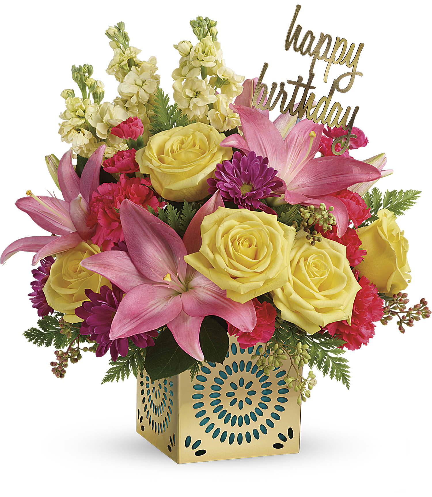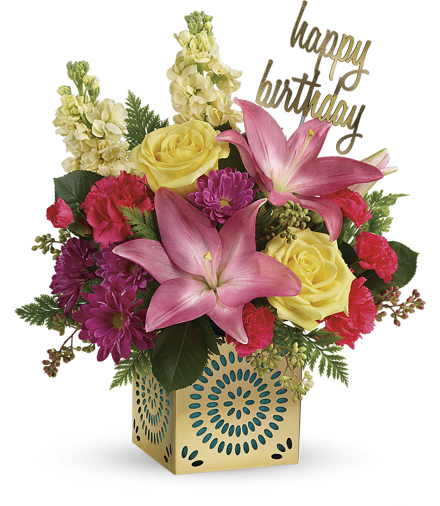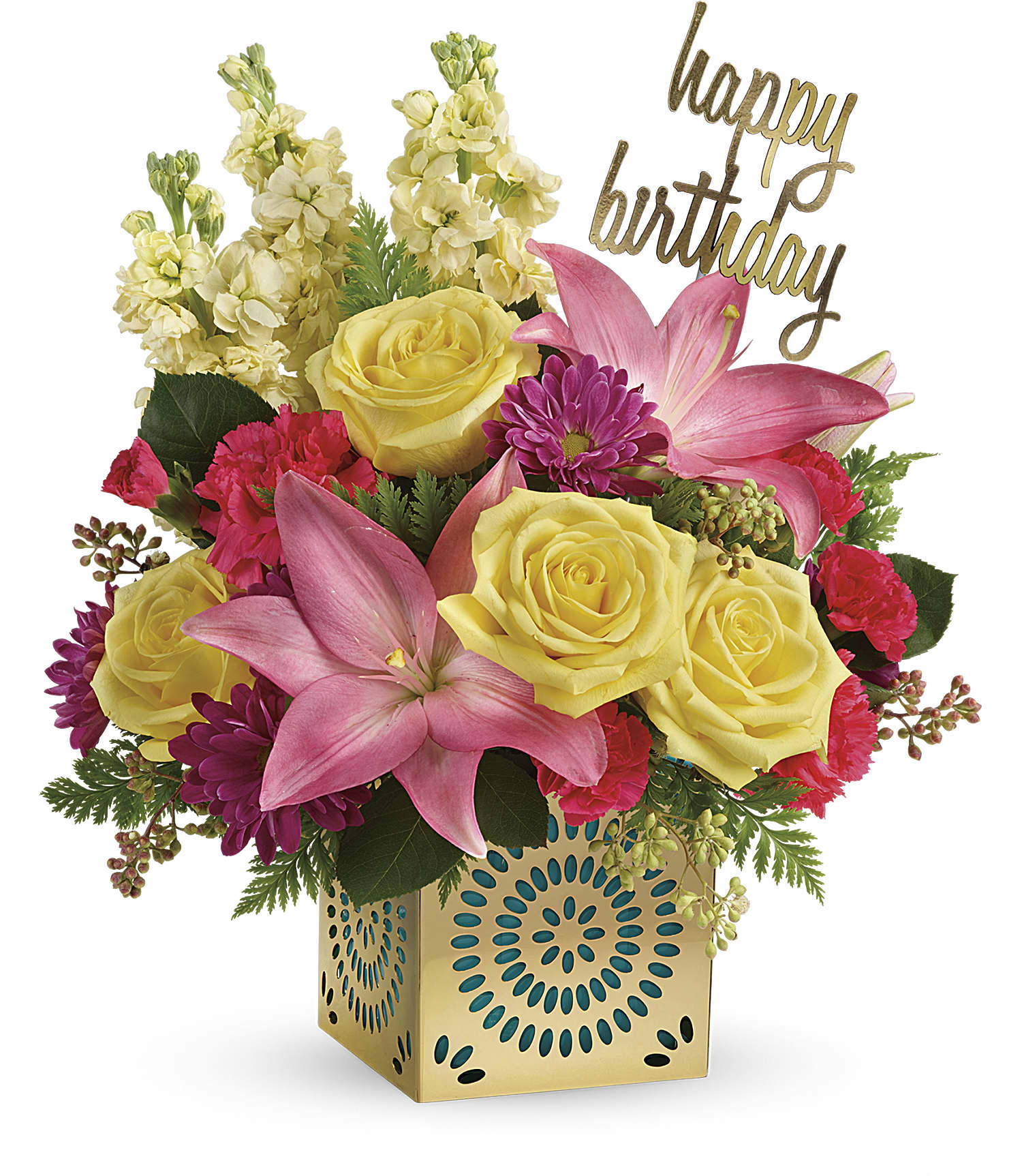 Make it a blooming unforgettable birthday with this gorgeous bouquet of soft yellow roses and pretty pink lilies! Complete with a Happy Birthday pick, the blooms are arranged in a gleaming golden cube with delicate punched details!