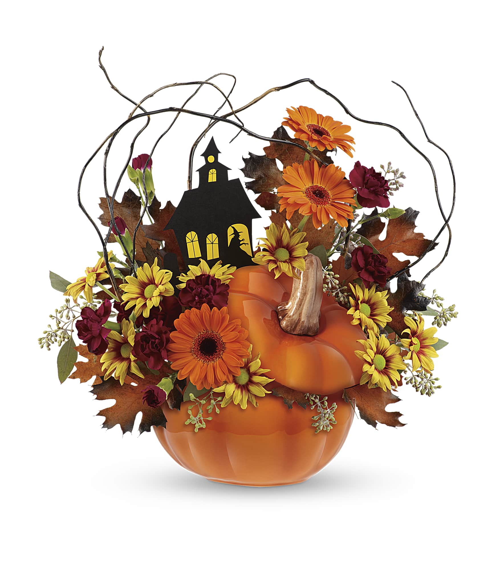This hauntingly cute arrangement brings the Halloween spirit to life with a seasonal assortment of fresh flowers, topped with a ghostly haunted house. It's hand-delivered in a charming ceramic pumpkin jar that's sure to become a fall decor staple!