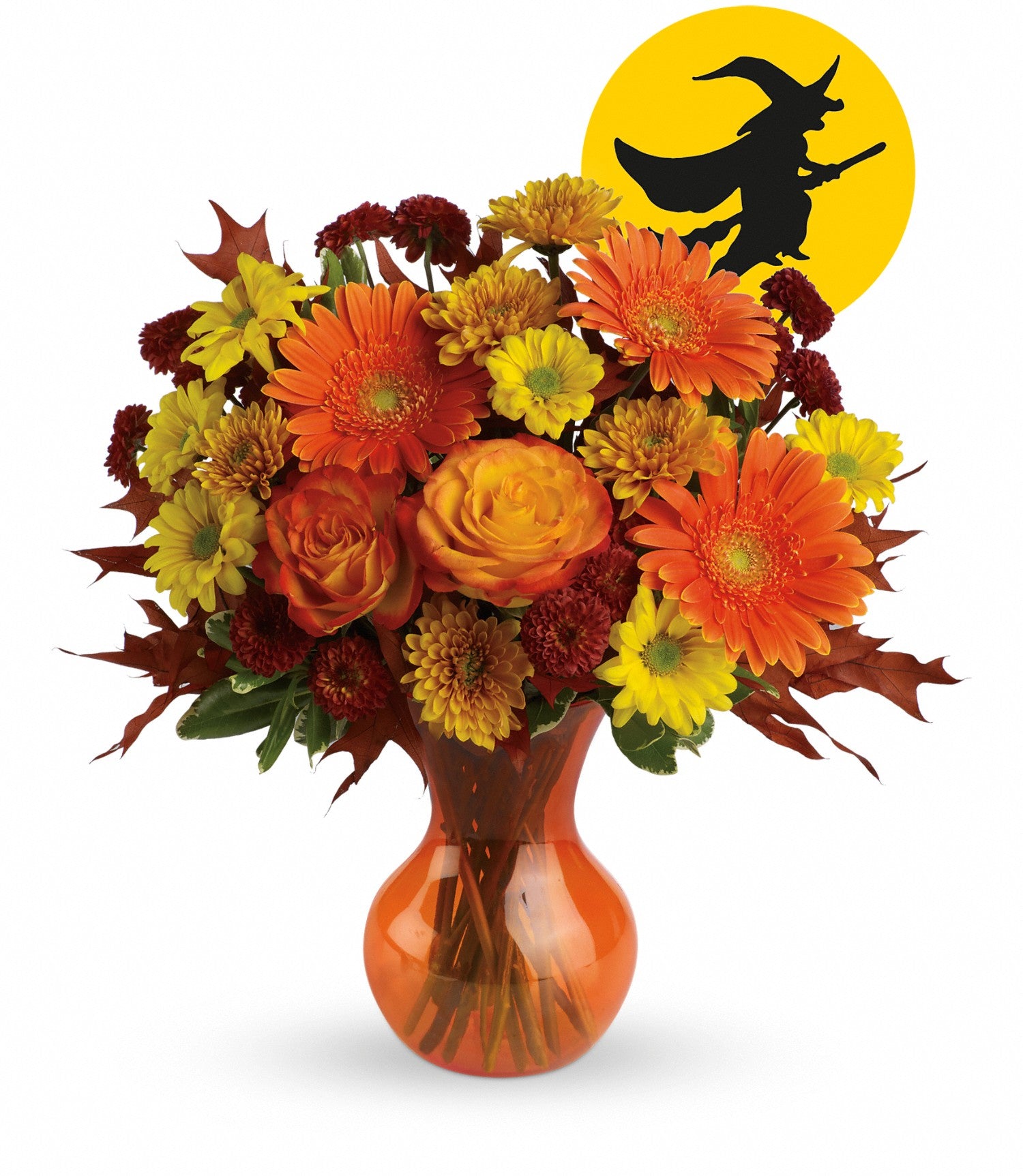 There's nothing superstitious about this arrangement. Orange roses, orange gerberas and yellow daisy chrysanthemums are accented by brown oak leaves and a spooky black witch. In a festive orange Serendipity vase, it's a keepsake that'll deliver thrills - all season long!