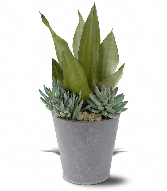 Add a bit of welcome, long-lasting greenery to a home or office with this potted succulent garden, featuring three types of plants. The rustic tin bucket will add a chic touch to any décor - from French Country to a modern loft.