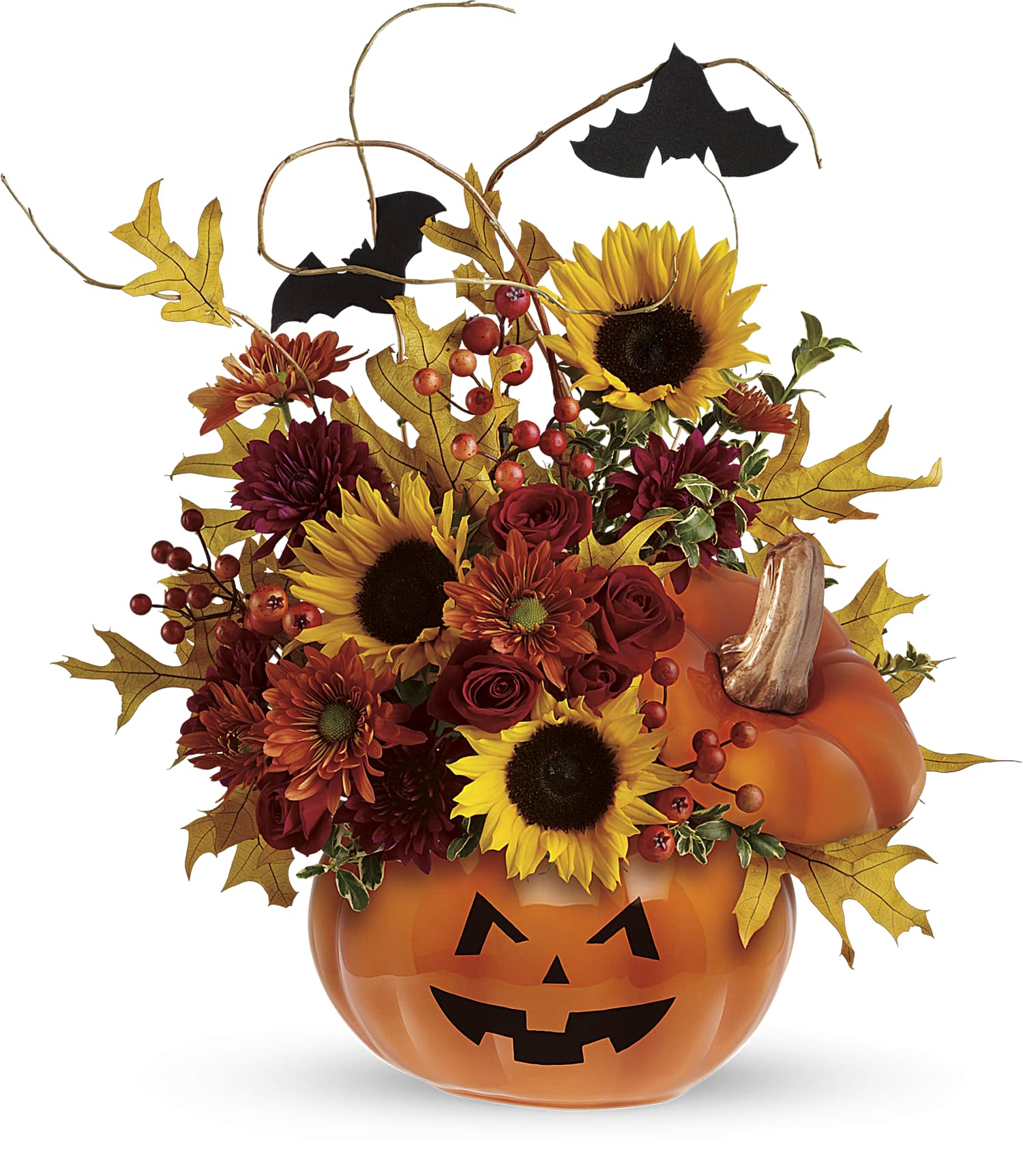 Red spray roses, bright yellow sunflowers, orange daisy spray chrysanthemums and curly willow make this bouquet so beautiful, it's scary! It's accented by two black bats and nestled inside our popular ceramic Trick & Treat Pumpkin, complete with a jack-o-lantern face. Happy Halloween!